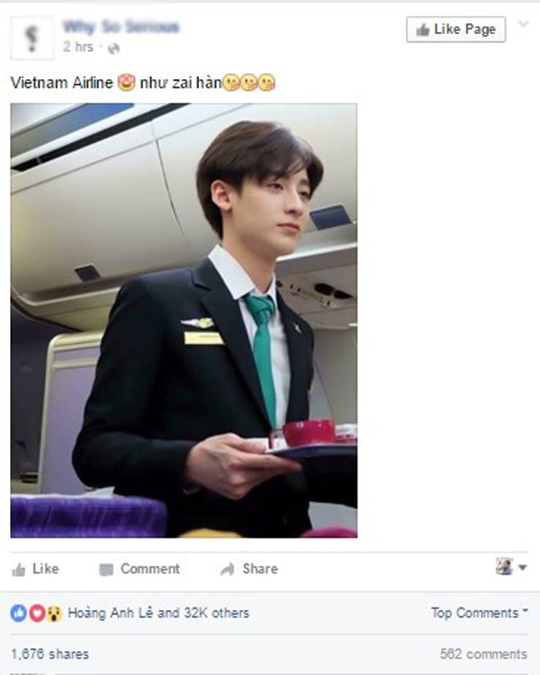 Theo đó, một trang mạng xã hội lớn ở Việt Nam đã đăng tải hình ảnh của một chàng tiếp viên hàng không với dòng trạng thái 'Vietnam Airlines, như trai Hàn'. Bức ảnh nhanh chóng thu hút sự chú ý của cư dân mạng. Nhiều bình luận khen nhan sắc của chàng trai tựa như một nam thần Hàn Quốc.