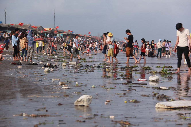 Rác thải phủ kín cả bãi cát, hàng nghìn người vẫn ngụp lặn trong dòng nước đen ngòm với vô vàn chai lọ, bèo già và cả tá vật dụng không tên dập dềnh theo sóng xô bờ.