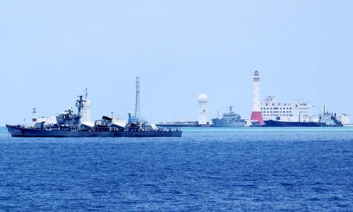 Tàu chiến Trung Quốc neo đậu gần đảo nhân tạo bồi đắp phi pháp trên đá Gạc Ma thuộc chủ quyền Việt Nam. Ảnh: VTG