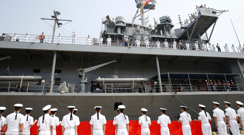 USS Blue Ridge cập cảng Thượng Hải và được các binh sĩ hải quân Trung Quốc tiếp đón nồng hậu, theo tờ Daily Mail (Anh).