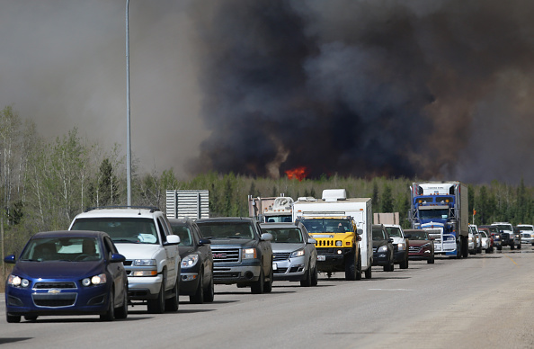 Dòng xe chở người tản cư đang nối đuôi nhau rời thành phố Fort McMurray bị cháy ở tỉnh bang Alberta ngày thứ Sáu. (Cole Burston/ Getty Images)