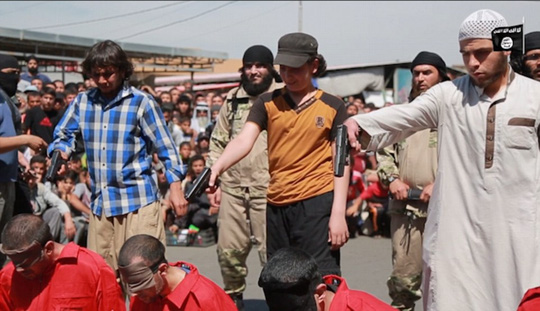 Một cảnh tượng khiến người xem rợn người mới đây do IS tung lên. Đó chính là nụ cười của một thiếu niên khi cầm vũ khí khi chuẩn bị xử bắn 5 người đàn ông vô tội sau khi các tay súng IS tìm người tình nguyện hành quyết tù nhân. Dường như giết người trở thành điều thú vị vậy?