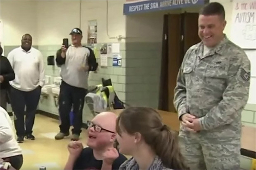 Cuộc đoàn tụ của người cha phi công và cậu con trai 15 tuổi mắc hội chứng Down khiến nhiều người cảm động. Phi công John Grieten, thuộc lược lượng "166th Airlift Wing, Delaware Air National Guard" của Mỹ, đã chia tay gia đình gồm người vợ thứ hai cùng một con trai 15 tuổi và một con gái 11 tuổi nửa năm nay.