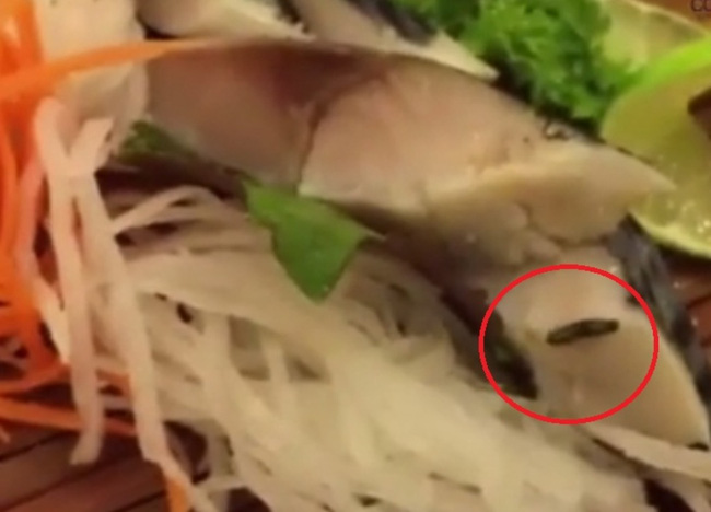 Còn "sinh vật lạ" được cho là con sâu còn sống, bò ngoe nguẩy trên đĩa cá ngừ, ông Dũng cho biết, con sâu có thể bò trên cuống lá tía tô, vào buổi tối các nhân viên khi rửa đã không phát hiện ra.