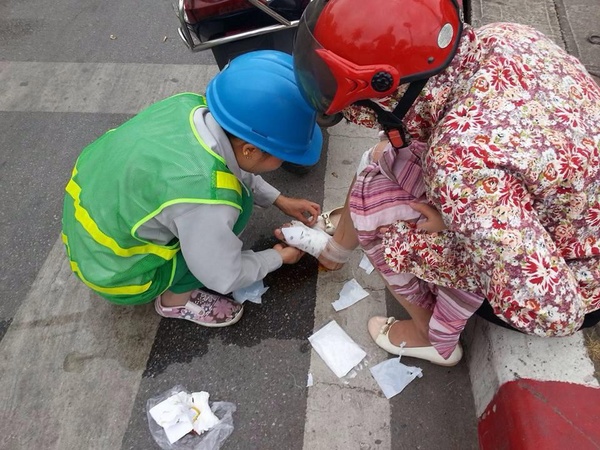 Thấy người gặp nạn, một chị công nhân vệ sinh môi trường ở gần đó đã chạy tới đỡ người phụ nữ này dậy, rồi dìu vào lề đường. Không những thế, chị ta còn chẳng ngần ngại chạy tới hiệu thuốc để mua bông băng và thuốc, sơ cứu cho người bị thương.
