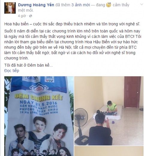 Ngay sau khi kết thúc đêm Chung kết Hoa hậu Biển 2016 tại Tuần Châu, Hạ Long, Dương Hoàng Yến đă chia sẻ 1 status khá dài với thái độ vô cùng bức xúc.