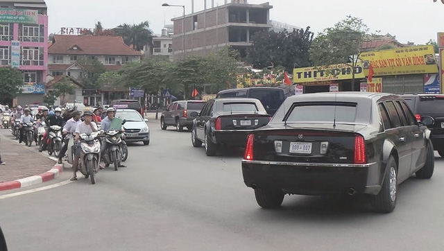 Dẫn đầu và "khóa đuôi" là những chiếc xe đặc chủng để đảm bảo an ninh và ở giữa đoàn là 2 chiếc siêu xe được cho là dùng để chở Tổng thống Mỹ.