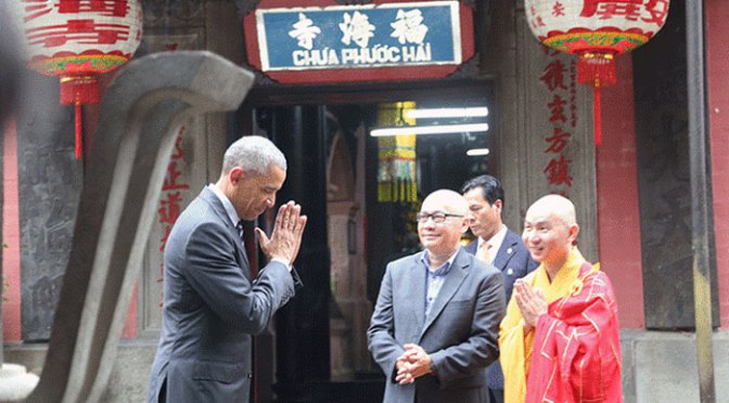 Theo đúng lịch trình Tổng thống Obama đã tới viếng thăm chùa Phước Hải tại Quận 1.Đang có rất nhiều câu hỏi được đặt ra không hiểu vì sao mà Đảng và TT Obama lại chọn một ngôi chùa thờ nhiều thần linh người Tàu để đến viếng thăm.Ẩn ý của TT Obama sau chuyến viếng thăm này?