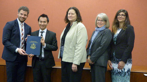 Hoàng Mẫn (thứ 2 từ trái qua) chụp ảnh cùng Thư ký Vụ Giáo dục Mỹ (bìa trái), Giám đốc Trung tâm nghiên cứu Đông Nam Á, Giám đốc Trung tâm nghiên cứu phát triển lãnh đạo các tổ chức phi chính phủ, Giám đốc hành chính YSEALI