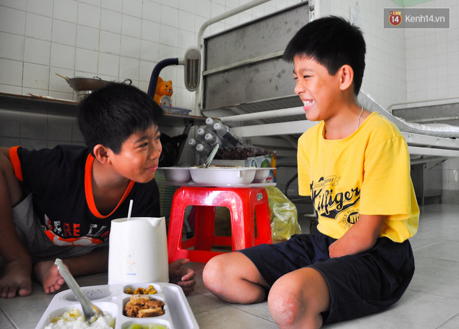 Đến khi chăm sóc các con đầy đủ, vợ chồng chị Mãnh và anh Nguyễn Văn Lập (42 tuổi, cha của Lâm và Huy) mới dùng cơm trưa. Anh Lập đang làm mướn ở quê nhà để nuôi con gái đầu ăn học nên thỉnh thoảng anh mới xuống Sài Gòn thăm vợ con.