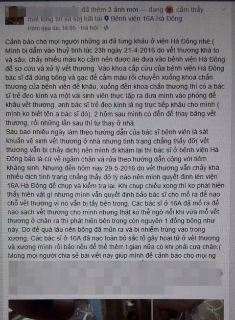 Theo thông tin chia sẻ của chủ tài khoản Facebook Hải A, khoảng 23h ngày 21/4/2016 anh giẫm phải mảnh thủy tinh, do vết thương khá to và sâu, chảy nhiều máu không cầm nên anh được đưa vào bệnh viện Hà Đông để sơ cứu và xử lý vết thương.