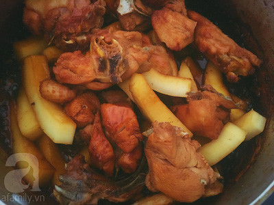 Thịt gà được kho nhừ bằng chính nước dừa và cùi dừa nên vị thơm béo của dừa thấm vào từng thớ thịt. Miếng thịt gà kho đậm vị, ngọt thơm ăn cùng cơm nóng ngon không gì bằng.