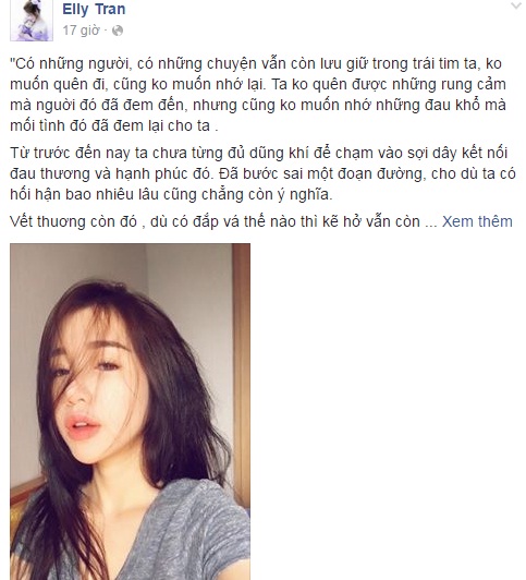 Mới đây nhất, trên trang cá nhân của mình, Elly Trần đã có những chia sẻ thẳng thắn xoay quanh chuyện tình cảm cũng như cuộc sống riêng tư của mình. Theo đó, “Hotgirl vòng một” bày tỏ, “Có những người, có những chuyện vẫn còn lưu giữ trong trái tim ta, không muốn quên đi, cũng không muốn nhớ lại. Ta không quên được những rung cảm mà nguời đó đã đem đến, nhưng cũng không muốn nhớ những đau khổ mà mối tình đó đã đem lại cho ta.