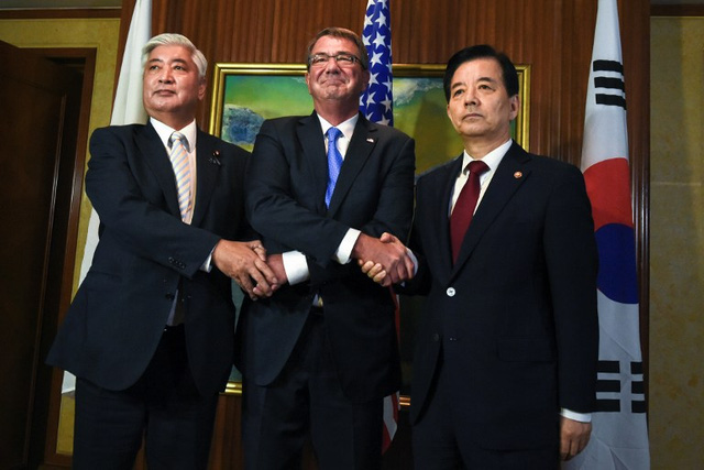 (Từ trái sang phải) Bộ trưởng Quốc phòng Nhật Bản Gen Nakatani, Bộ trưởng Quốc phòng Mỹ Ash Carter và người đồng cấp Hàn Quốc Han Min-koo gặp nhau bên lề Đối thoại Shangri-La ngày 4/6 (Ảnh: AFP)