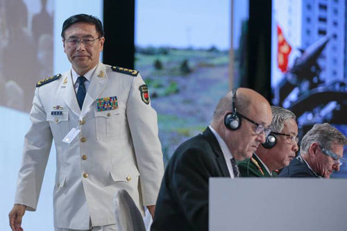 Đô đốc Tôn Kiến Quốc (áo trắng), trưởng đoàn Trung Quốc, lên phát biểu tại Đối thoại Shangri-La. Ảnh: Reuters