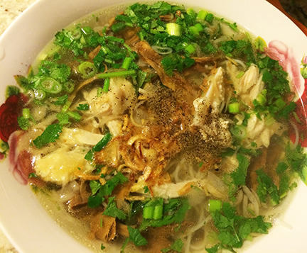 -Cho bún ra tô, cho thịt gà và măng lên trên, rắc hành lá và rau răm cắt nhuyễn. Chan nước dùng và rắc hành phi lên mặt.