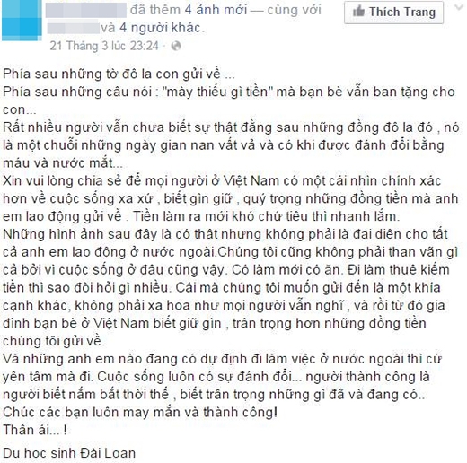 Và những anh em nào đang có dự định đi làm việc ở nước ngoài thì cứ yên tâm mà đi. Cuộc sống luôn có sự đánh đổi… người thành công là người biết nắm bắt thời thế, biết trân trọng những gì đã và đang có”.