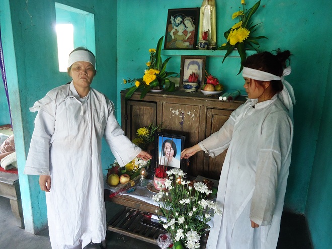 Pháp luật & Thời đại tìm về nhà em Ái. Ngôi nhà nằm lọt thỏm ở khu vực toàn cát trắng, xe máy không thể chạy vào được. Người mẹ ngồi thất thần bên bạn thờ con gái nhỏ. Bà Nguyễn Thị Hương (49 tuổi) tâm sự, chồng mất sớm do bệnh động kinh.