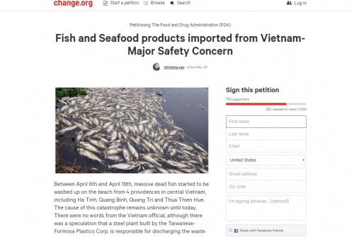 Ba người Mỹ gốc Việt đă soạn một thỉnh nguyện thư đưa lên mạng xin chữ kư của người Việt cũng như người Mỹ, nhằm yêu cầu Cơ Quan Thực Dược Phẩm FDA của Hoa Kỳ kiểm nghiệm hải sản từ Việt Nam.