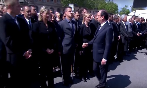 Trong lễ tưởng niệm hai vợ chồng cảnh sát bị IS sát hại, tổng thống và thủ tướng Pháp lần lượt đi bắt tay đại biểu nhưng bị một sĩ quan làm ngơ.