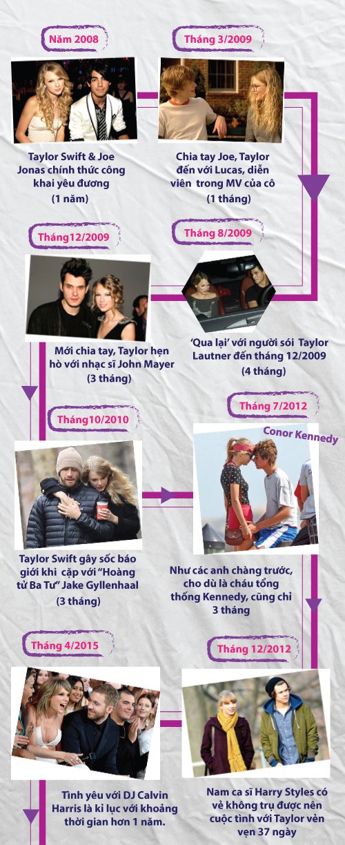 Vietbf.com - Người đẹp Taylor Swift thay người yêu nhiều và nhanh nhất trong 7 năm đã yêu 8 người, mà yêu nhanh nhất chỉ kéo dài có 37 ngày, vì vậy mỹ nhân này mới được mệnh danh "yêu cả Hollywood", vì vậy chặng đường yêu của cô công chúa nhạc đồng quê luôn là một đề tài không bao giờ nguội.