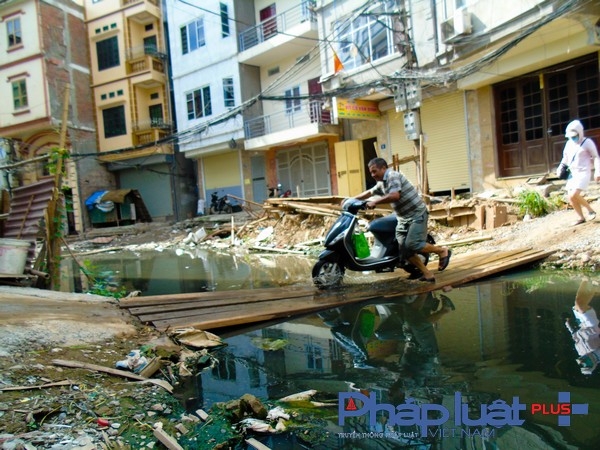 Theo quan sát của phóng viên Pháp luật Plus, tại đây mặt đường rất và ghồ ghề, nhiều đoạn người dân phải sử dụng ván, gạch lát lên mặt đường để đi, nhiều đống rác lớn được đổ chất đống và khoảng cách an toàn giữa khu vực thi công với khu đường dân sinh không được đảm bảo. Ngay cạnh đó là dòng nước đen ngòm, hôi thối chạy tràn lên mặt đường gây ô nhiễm nặng môi trường sống của các hộ dân.