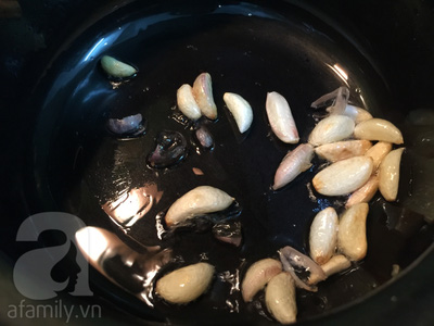 Đặt nồi lên bếp, cho một chút dầu ăn vào chờ nóng thì cho tỏi nguyên tép vào phi xém vàng.