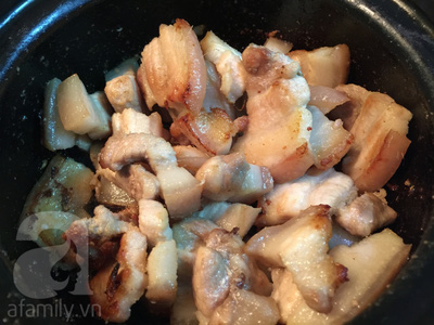 Khi thịt đã cháy cạnh thì lược bớt phần nước mỡ. Nêm gia vị, chút nước mắm.