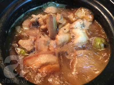 Sau đó đổ nước xăm xắp mặt thịt. Cho sấu vào. Đậy vung nồi om cho tới khi thịt mềm.