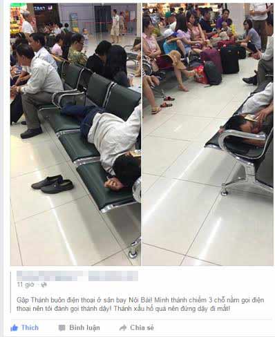 “Trước chuyến bay Hà Nội - Đà Nẵng tại sân bay Nội Bài, khi hàng trăm hành khách đang ngồi chờ tại lối ra sân bay thì người này điềm nhiên nằm buôn điện thoại mặc bao nhiêu phụ nữ trẻ em không có chỗ ngồi.