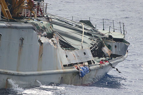 Những mảnh sắt bị gãy cong vênh chĩa ra sắc nhọn. Một phần của xuồng bên mạn trái cũng bị thủng. Tất cả giá xuồng bị hỏng. Một phao bè cứu sinh tự thổi bị văng mất. Từ phần cabin trở về sau lái dài khoảng 10m bị biến dạng hoàn toàn.
