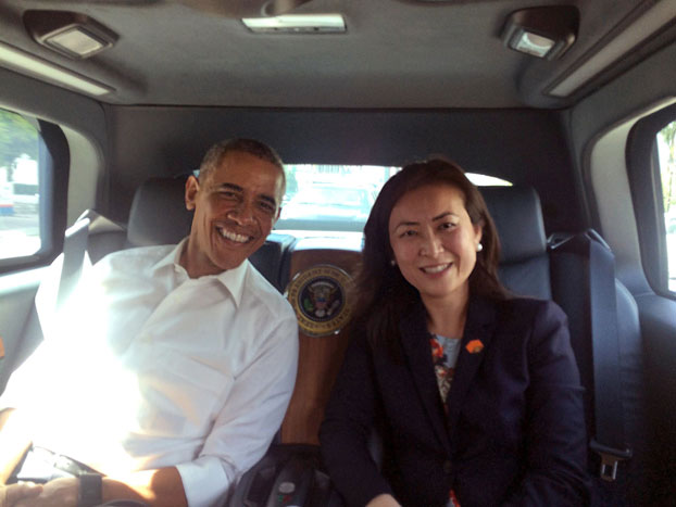 Nữ cố vấn gốc Việt Elizabeth Phù và Tổng thống Hoa Kỳ Barack Obama trong xe riêng của ông trên đường tới một sự kiện về người tị nạn tại Malaysia vào tháng 11 năm 2015. Hình do Bà Elizabeth Phù gửi tặng RFA