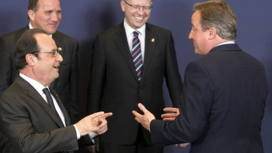 Tổng thống Pháp Francois Hollande (trái) và Thủ tướng Anh David Cameron (phải) nói đùa xua tan không khí căng thẳng tại hội nghị. Ảnh: AP