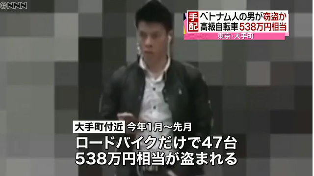 Vietbf.com - Một thanh niên người Việt Nam đã bị tình nghi lấy cắp đi 47 chiếc xe đạp đua đắt tiền, vì người Việt tên Huy Tinh này được cho là đã lấy cắp một chiếc xe đua trị giá 264.000 Yên Nhật từ một bãi giữ xe đạp. Cho nên với số xe đạp đua đắt tiền bị mất có tổng trị giá lên tới 5,38 triệu Yên Nhật khiến cảnh sát Nhật phải truy nã.