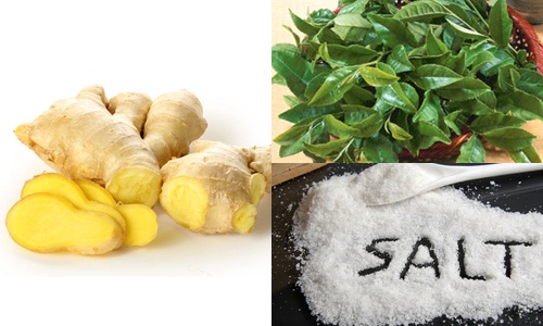 – Sau đó cho nhúm muối vào bát nước gừng – chè xanh rồi dùng thìa khuấy đều cho muối tan hết là có thể sử dụng được.