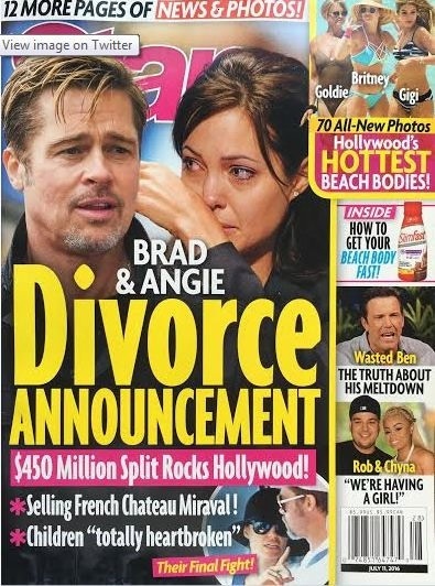 Trên trang bìa của tờ tạp chí Star in hình ảnh Pitt trán nhăn nheo, còn Jolie thì nước mắt hai hàng cùng dòng tiêu đề: “Angelina Jolie và Brad Pitt tuyên bố ly hôn”, “Cuộc chia tay trị giá 450 triệu USD làm rúng động Hollywood”, “Bán lâu đài ở Pháp”, “Các con rất buồn”.
