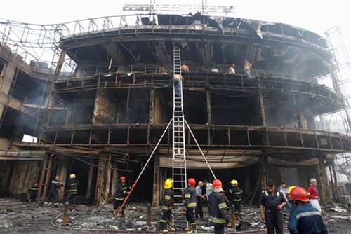 Một tòa nhà bị thiêu rụi sau vụ đánh bom. Ảnh: Reuters