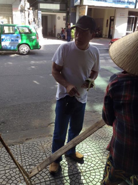 Người đàn ông Trung Quốc cư xử thô lỗ với chị bán chuối (Ảnh Nguyễn Duy Khoái)