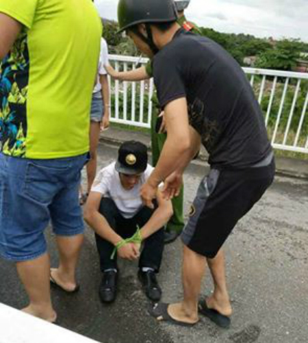 Chúng dừng xe bên đường, tên cướp cầm dao nhảy qua con lươn định lại gần ôtô tấn công. Sau đó hắn bị tài xế ôtô và 3 người đàn ông khác bắt gọn. Tên còn lại đã kịp chạy xe máy tẩu thoát.