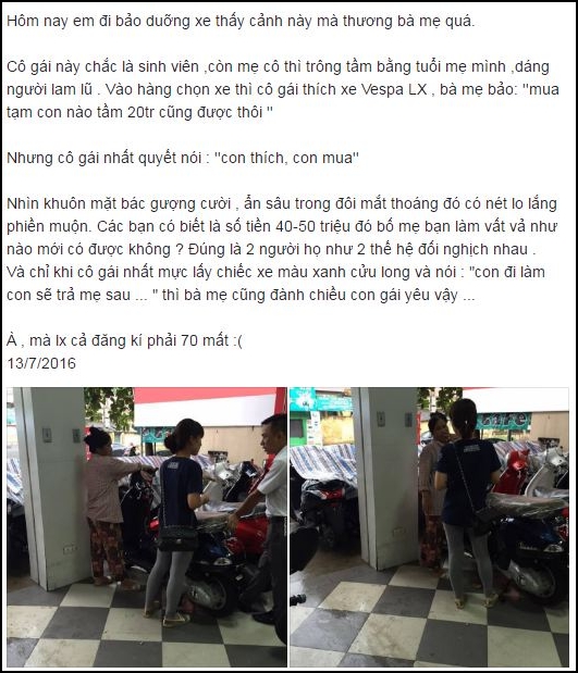 Cô gái này chắc là sinh viên, còn mẹ cô thì trông tầm bằng tuổi mẹ mình, dáng người lam lũ. Vào hàng chọn xe thì cô gái thích xe Vespa LX, bà mẹ bảo: ”Mua tạm con nào tầm 20tr cũng được thôi ”