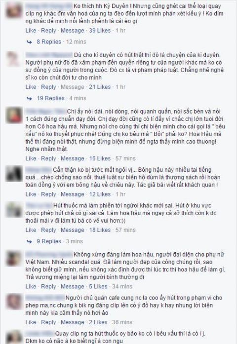 Ngày 11/7 vừa qua dư luận hết sức xôn xao khi trên mạng xuất hiện clip hoa hậu Kỳ Duyên hút thuốc lá trong một quán cà phê. Đoạn video trên đă gây ra nhiều tranh căi trong cộng đồng mạng. Nhiều người chỉ trích v́ hành động hút thuốc của Kỳ Duyên v́ cô là hoa hậu, cần phải biết giữ h́nh ảnh. Bên cạnh đó cũng có không ít ư kiến lên tiếng bênh vực cô bởi đấy là sở thích là quyền tự do cá nhân của mỗi con người., trong đó có một số người là nghệ sĩ nổi tiếng.