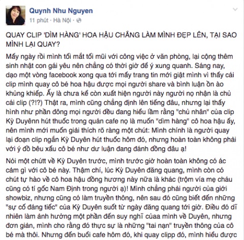 Chúng tôi xin phéo được trích nguyên văn những chia sẻ của chị N.N.Q :”Quay clip "d́m hàng" hoa hậu cũng chẳng làm ḿnh đẹp lên, nên ḿnh làm thế để làm ǵ?! Mấy ngày rồi ḿnh tối mắt tối mũi với công việc ở văn pḥng, lại cộng thêm sinh nhật con gái yêu nên chẳng có thời giờ để ư xung quanh. Sáng nay, dạo một ṿng facebook xong qua tới mấy trang tin mới giật ḿnh v́ thấy cái clip ḿnh quay cô bé hoa hậu được mọi người share và b́nh luận ồn ào khủng khiếp. Ấy là chưa kể c̣n xuất hiện người này người nọ nhận là chủ cái clip (?!?)