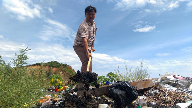 Sau khi dùng xẻng đào chất thải của Formosa ở bãi rác Thiên Cầm lên, ông Anh kể: “Năm 2015, trước khi phát hiện chất thải Formosa đổ trái phép ở bãi rác, người dân thường thấy có xe tải chở chất thải bùn màu đen đến đổ xuống rồi gạt rác thải sinh hoạt lên để che lấp”.