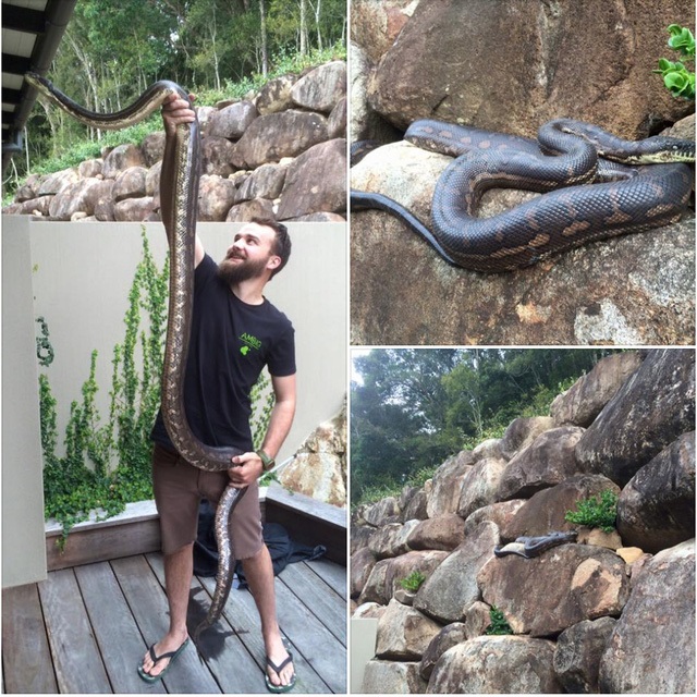 “Tôi được gọi tới một ngôi nhà xinh đẹp ở vùng Cooray Mountain vào chiều hôm qua để bắt con trăn Python dài 3m. Ngay khi tôi tới nơi thì con trăn này đang nằm trên một hòn đá ở ngay phía nhà dân”, Lockie, người trực tiếp bắt con trăn khổng lồ, cho biết.