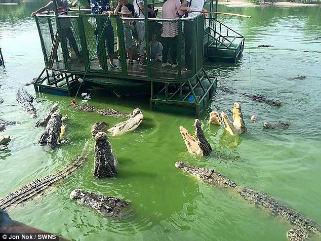 Có thể thấy hơn chục vị khách, trong đó có cả trẻ em, đã trèo lên cái chòi sắt, nổi giữa mặt hồ nhờ những chiếc can nhựa, tại một trang trại cá sấu thuộc khu du lịch Vương quốc Voi ở Chonburi, Thái Lan.