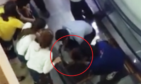 Đám đông cố gắng giải cứu bé trai bị thang cuốn siêu thị kéo vào khe. (Ảnh: VnExpress)