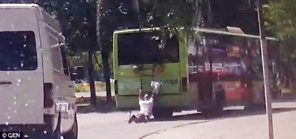 Trong đoạn video, có thể thấy một người đàn ông đang dùng hai tay bám vào phía sau một chiếc xe buýt đang chạy nhằm trốn tiền vé xe, hoặc cũng có thể vì không muốn lỡ mất cuộc hành trình sắp tới.