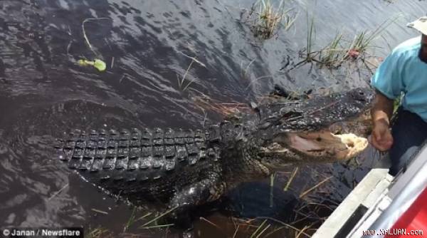 Tiến lại sát tàu, cá sấu thi thoảng mở rộng miệng, vươn lên cao trông rất rùng mình. Điều thú vị là “sát thủ đầm lầy” khá thân thiện, không có động thái tấn công.