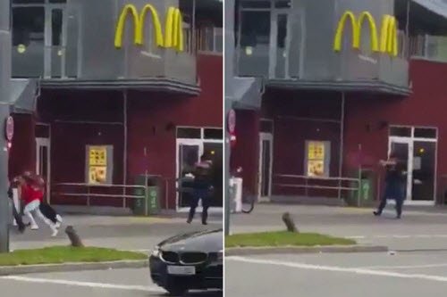 Hình ảnh từ đoạn video đăng tải lên mạng Twitter cho thấy nghi phạm trong trạng phục màu đen đã bắn 20 phát đạn vào những người qua đường bao gồm cả trẻ em bên ngoài nhà hàng McDonald's.