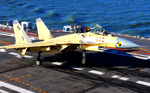 Tiêm kích Cá mập bay J-15 luyện tập hạ cánh trên tàu sân bay Liêu Ninh. Ảnh: Xinhua